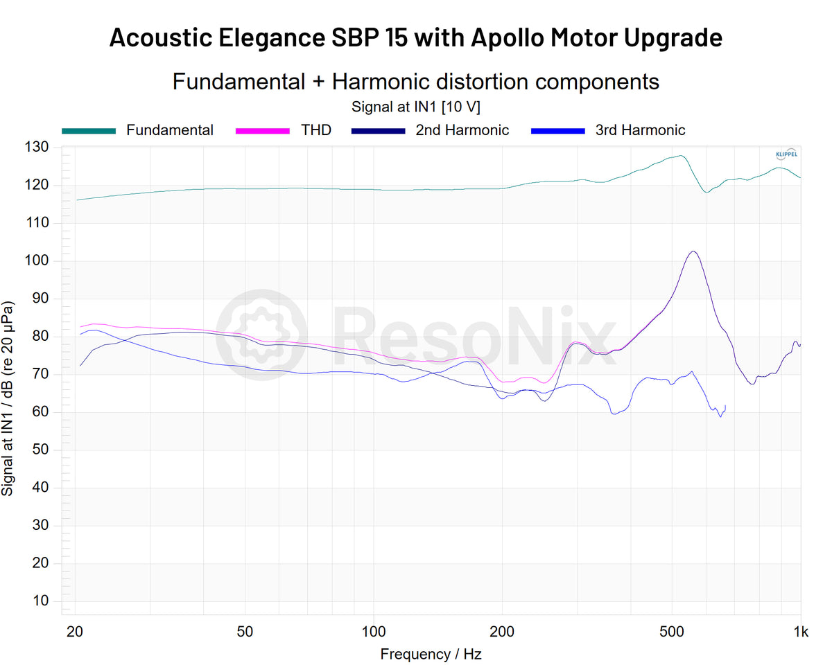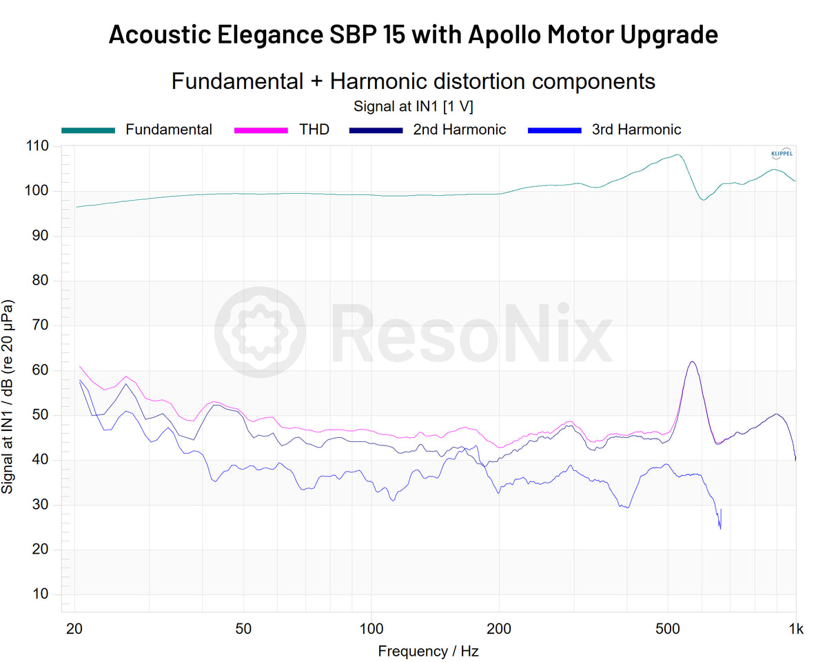 The Acoustic Elegance SBP 15 with the Apollo Motor upgrade is, from a distortion and linearity standpoint, about as close to perfect as a 15"" subwoofer gets. In the 20 to 120 Hz range that matters most for car audio, especially for infinite baffle and large sealed applications, it stays dead clean across the board, both in TRF measurements and in my own personal subjective use. Harmonic distortion remains extremely low even as you approach its mechanical limits, and the response stays stable and uncolored through the entire passband, extending cleanly up toward 500 Hz. There are no unexpected artifacts, no compression issues in band, and no signs of instability even as you start to push it. On top of that, the motor shows near-perfect BL symmetry within its intended range, and exceptionally well-controlled inductance behavior, both with respect to position and current. It behaves exactly like you'd hope a purpose-built low-distortion driver would.