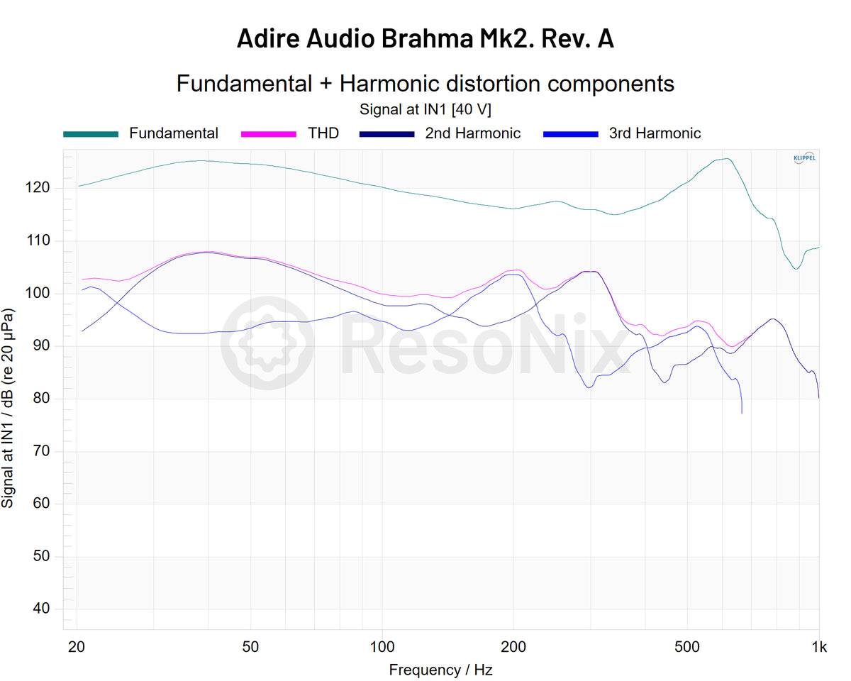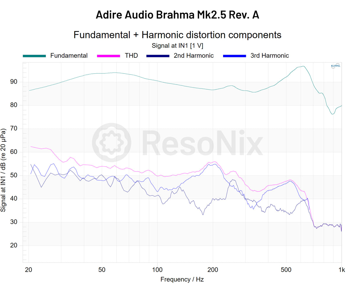 In this sample and under these test conditions, the 1 volt baseline shows moderate broadband distortion above about 40 Hz, with a pretty notable rise in distortion toward the lowest frequencies. Around 20 Hz THD is ≈6 percent with H2 and H3 distortion contributing, and there is a small broad feature that grows as a wide peak at 200 Hz where even order distortion becomes more noticeable. Above roughly 40 to 80 Hz the baseline remains comparatively controlled.