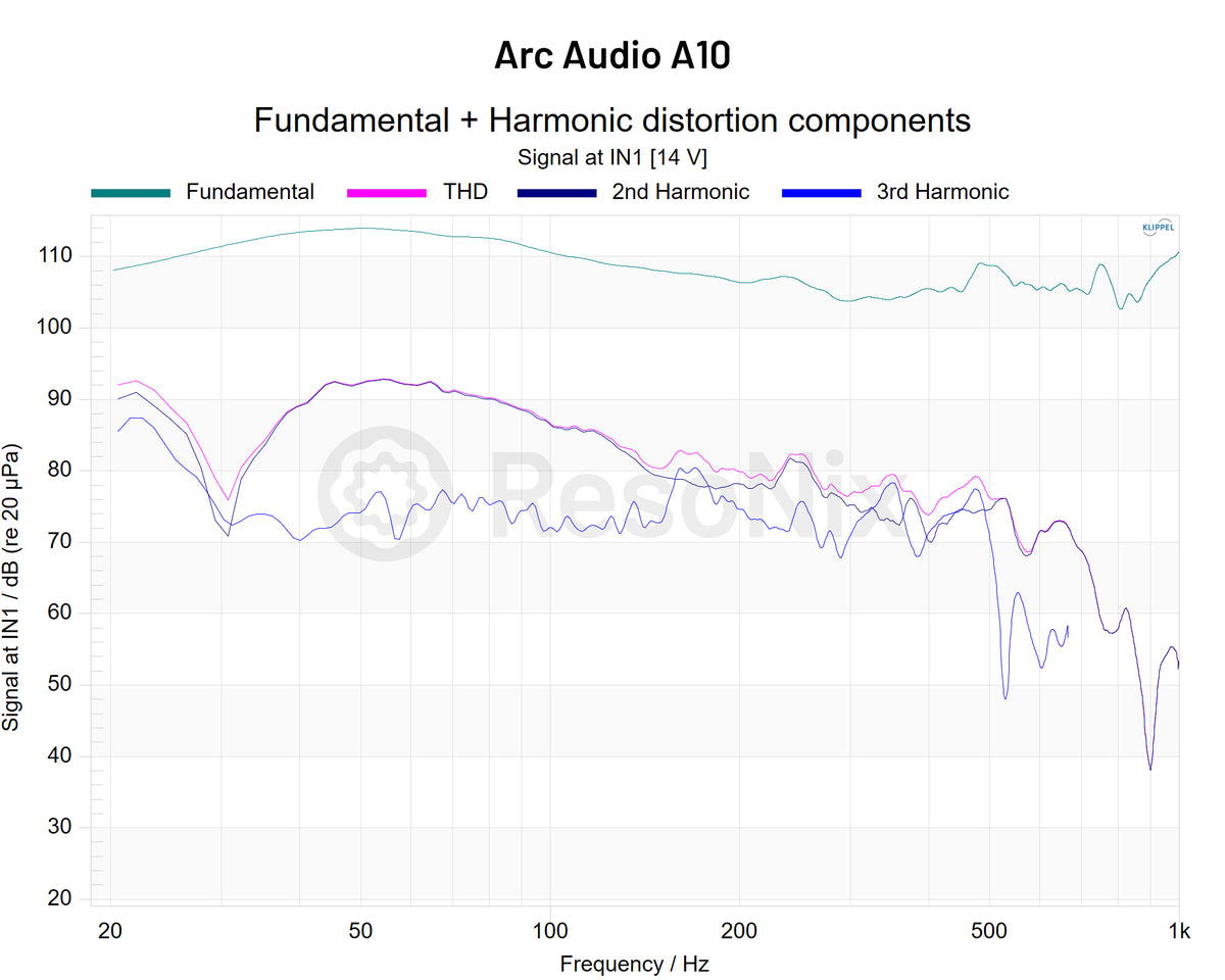 In this sample and under these test conditions, the Arc Audio A10 shows unusually high low‑frequency distortion that changes dramatically with drive level. At 1 volt, THD is jagged below 40 Hz with a large 32 percent peak near 20 Hz and another around 30 Hz near 25 percent. Both H2 distortion and H3 distortion are visible across the lowest octave and drop sharply above 50 Hz. At 14 volts, the distortion pattern smooths into a broad rise toward the bottom, dominated by H2 distortion between 25 and 60 Hz and H3 distortion below 25 Hz. The deep 30 Hz distortion dip on the 14v measurement vs the large 30hz peak in the 1v measurement is likely from cone or dust‑cap flex that changes behavior at varying levels of excursion. The contrast between the low‑level spike and high‑level dip suggests flexing cone behavior over stroke that shapes the driver’s unique distortion profile.