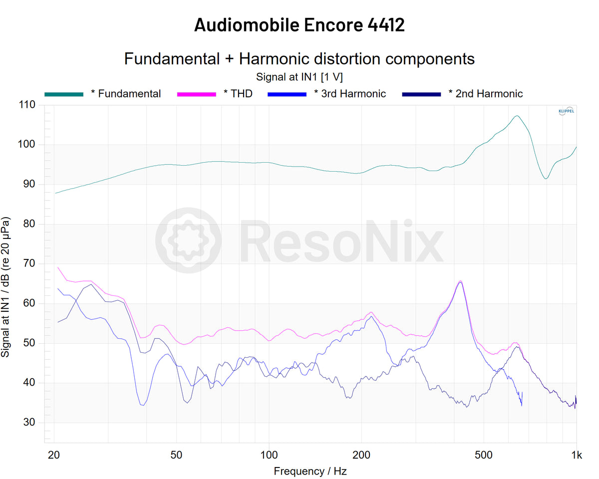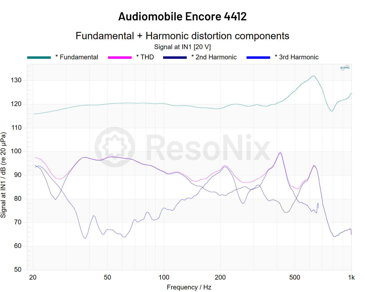 In this sample and under these test conditions, the 1 volt baseline distortion run is controlled above about 40 Hz, but distortion rises as it plays lower. THD touches just past the top of the 10 percent visible window around 20 Hz, with dominant H3 distortion at the very bottom and H2 distortion also peaking in the upper 20hz. From 40 to 80 Hz distortion sits around 1%. No narrow, level invariant spikes are visible in the 20 to 120 Hz band at this drive.