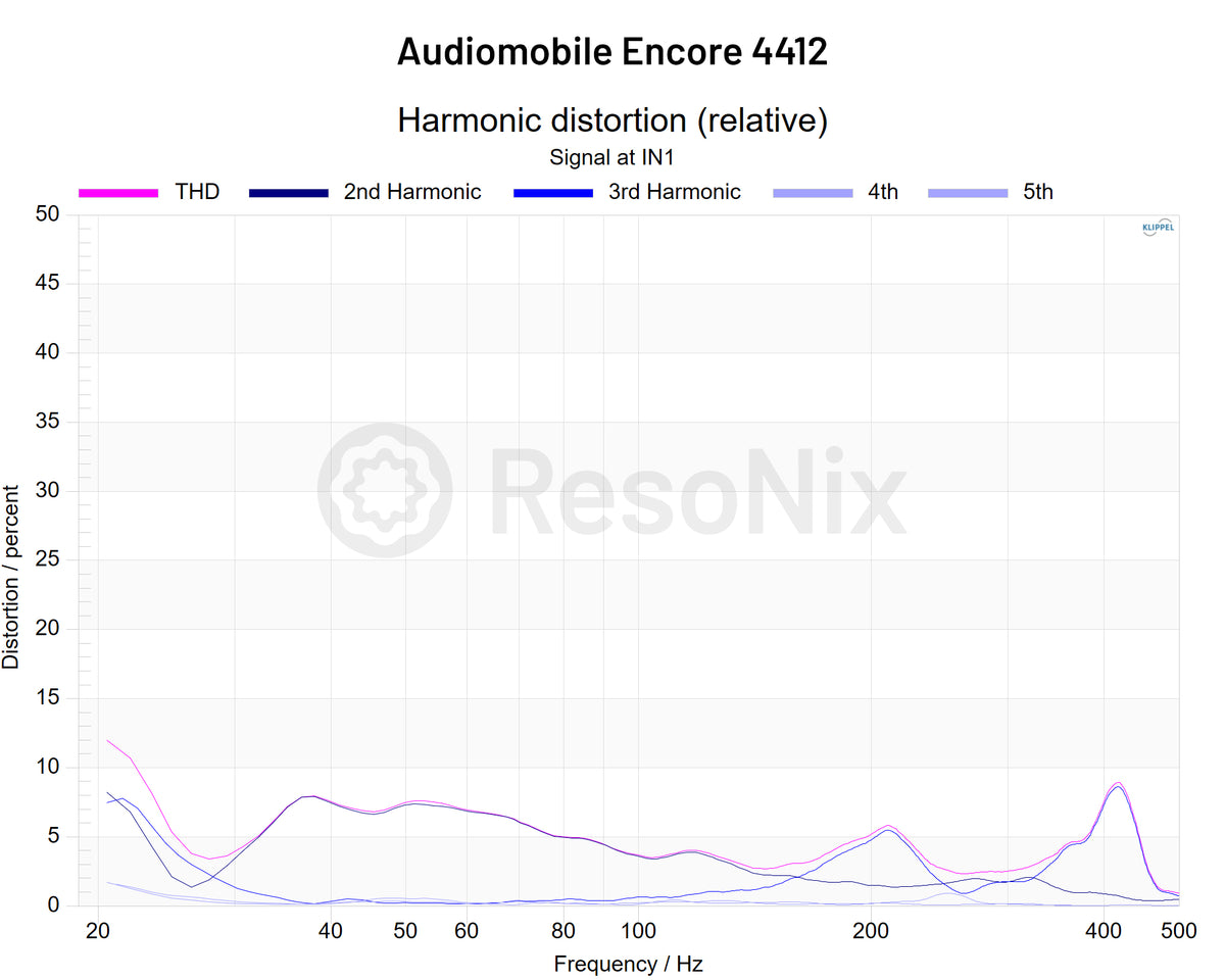 Distortion trends upward into the lowest octave, reaching just past the 10 percent plot ceiling at 20 Hz with dominant H3 distortion below roughly 25 Hz; H2 distortion also features a pretty high spike centered around 27 Hz. From about 40 to 80 Hz, THD falls 1 percent range and remains comparatively steady. No narrow, level invariant spikes are evident between 30 and 120 Hz on this sweep.