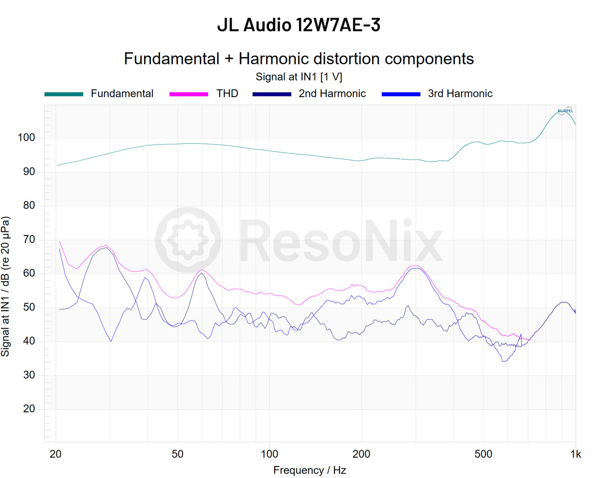 Baseline distortion is already very elevated for a 12 inch subwoofer of this class. THD reaches about 7.5 percent at 20 Hz and there is a second feature near 30 Hz at just under 5 percent. Above roughly 40 Hz, distortion does not collapse to very low values, and both H2 distortion and H3 distortion remain visible through the passband. Response shape is not very stable at this level with a few artifacts that vanish at higher level, which indicates some level of operating noise within the driver itself, likely minor mechanical or airflow interactions that are masked at higher drive.