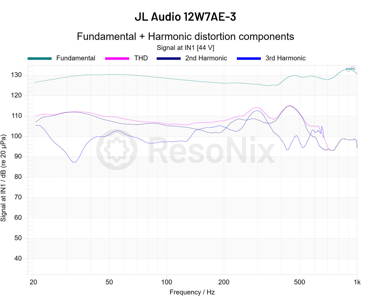 Method recap: Method recap: Nearfield mic positioned at 1/10th the cone diameter plus 2 inches, on-axis. Response measured to 1 kHz and THD to 500 Hz. 1/6-oct smoothing. Two drive levels, 1 V baseline and a high level set at 44 V per the under BL-70 rule derived from LSI for this unit, reaching 32.3mm of excursion at 20Hz. Distortion reported both as percent and by harmonic.