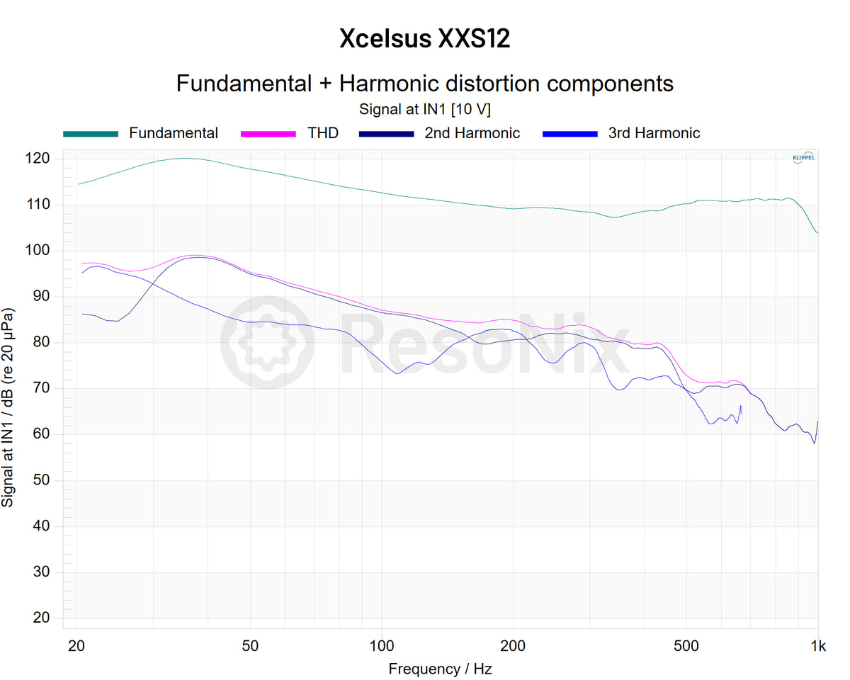 Distortion is elevated in the lowest octave and remains visible well above 40 Hz. There is a peak in distortion at 20 Hz a bit over four percent, dominated by H3 distortion, and a second peak at 28 Hz around five percent, primarily H2 distortion.